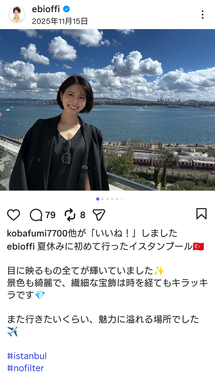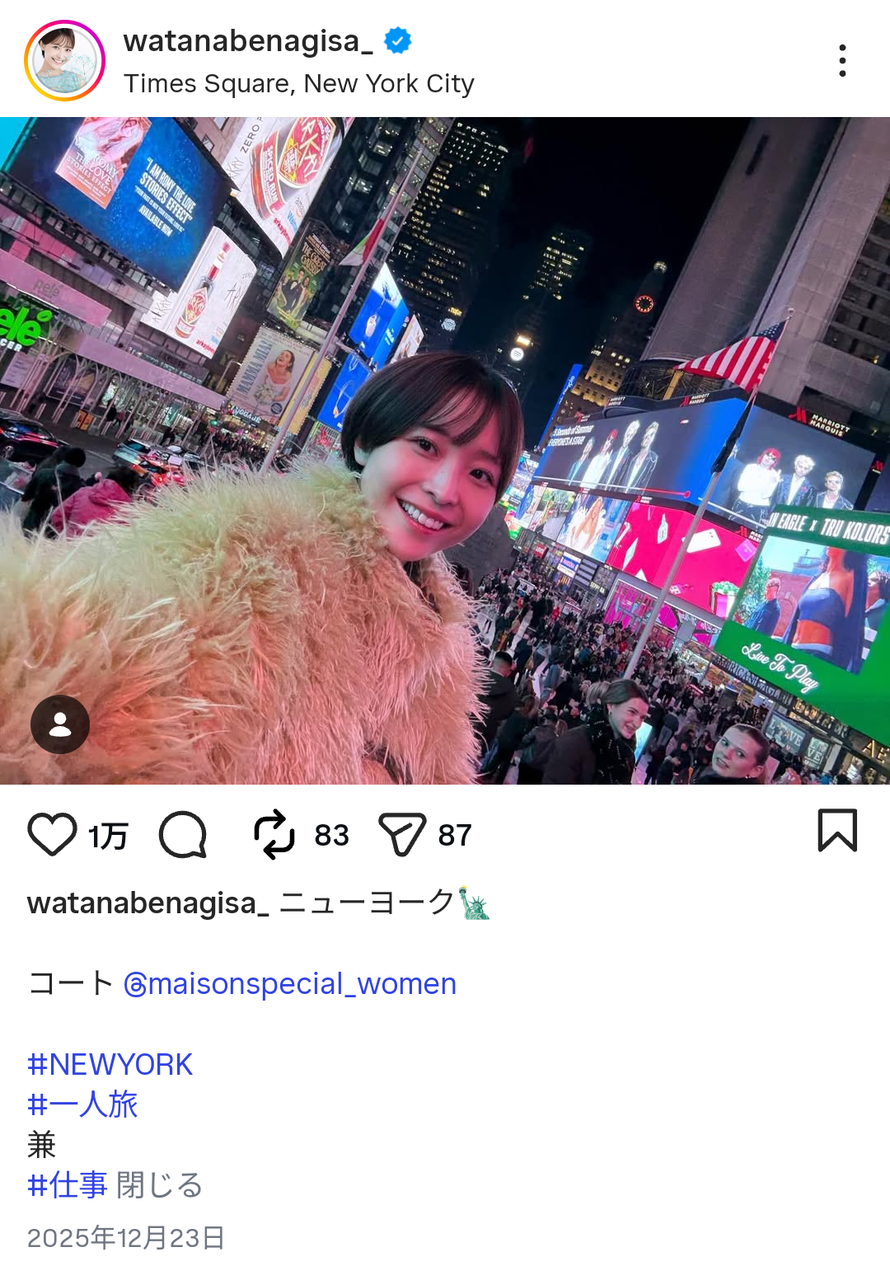 ストーリーズで「防犯上、SNSはリアルタイムでは投稿しない派です! ニューヨークに行ったのも冬の始まり頃。リアルタイムで投稿するのは危ないし、仕事で更新しなければいけない日が決まっているので写真が時系列通りに並ぶことはないです!」とつづった。