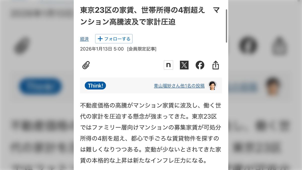 不動産価格の高騰がマンション家賃に波及し、働く世代の家計を圧迫する懸念が強まってきた。東京23区ではファミリー層向けマンションの募集家賃が可処分所得の4割を超え、都心で手ごろな賃貸物件を探すのは難しくなりつつある。変動が少ないとされてきた家賃の本格的な上昇は新たなインフレ圧力になる。