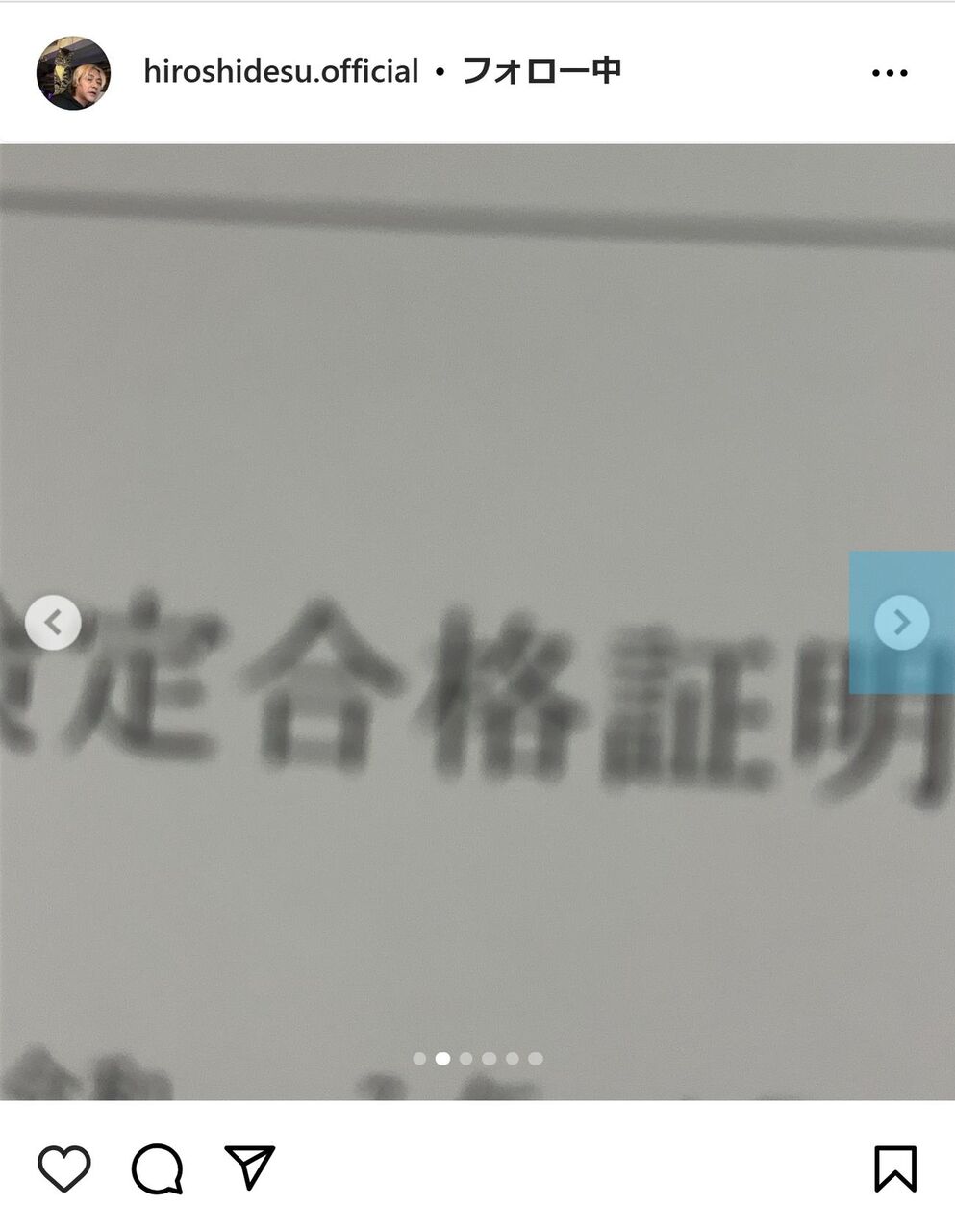 今回の投稿で「大型二輪の免許取りに、山形で6日間合宿してたよ。合格したよ。緊張したよ」と、検定合格証明書の画像をアップして報告。